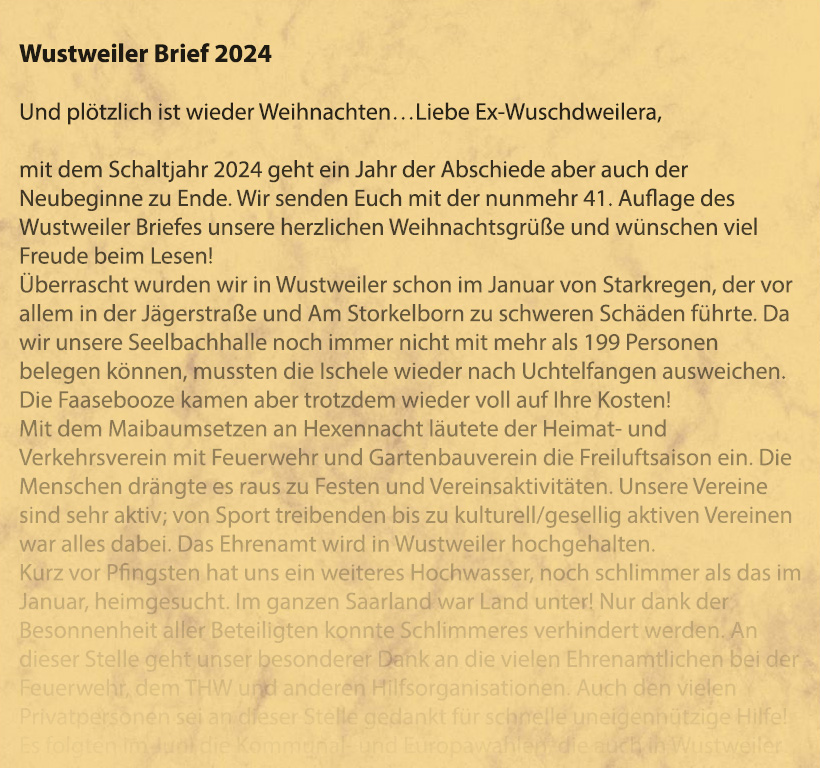 Nunmehr in der 41. Ausgabe geht der Wustweiler Brief auf die Reise an die vielen Exil-Wustweiler in aller Welt.